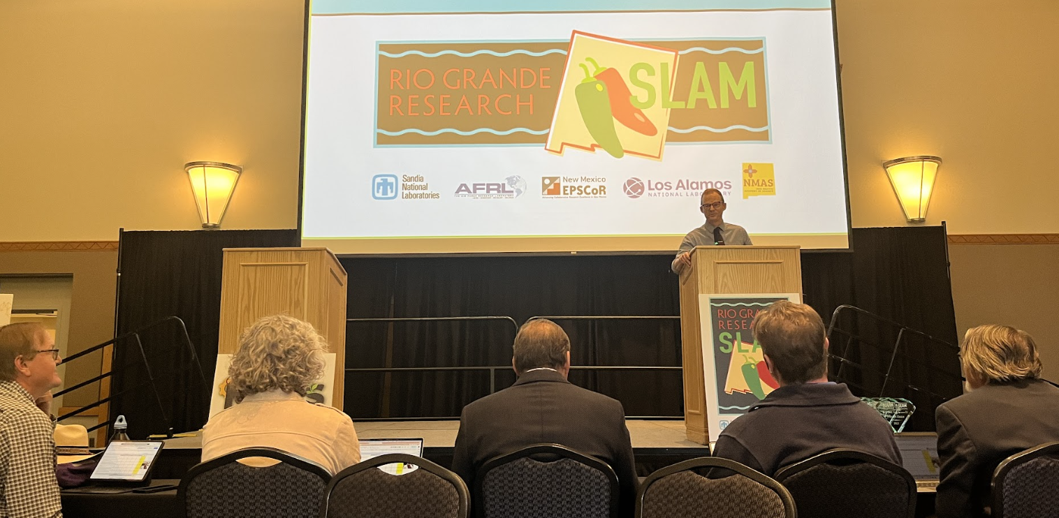 In the afternoon, local meteorologist Byron Morton from KOAT emceed the second annual Rio Grande Research SLAM. The dynamic competition featured nine postdoctoral researchers from three New Mexico research institutions (NM EPSCoR, Sandia National Laboratories, and Los Alamos National Lab) and tasked contestants with presenting their research to a public audience in three minutes with one static slide.
