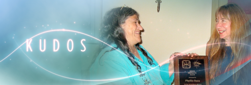 Photo, left to right, nominator Tinka Gammel presents the IMPACT! Award to Phyllis Baca. Photo in banner and press release courtesy of New Mexico Network for Women in Science and Engineering.<
