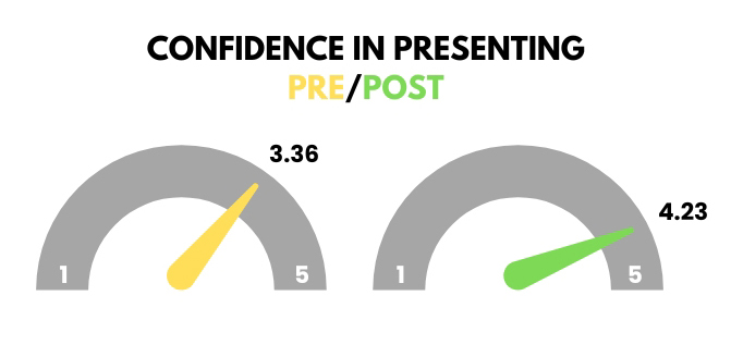 Confidence in presenting research also rose from 3.36 to 4.23.