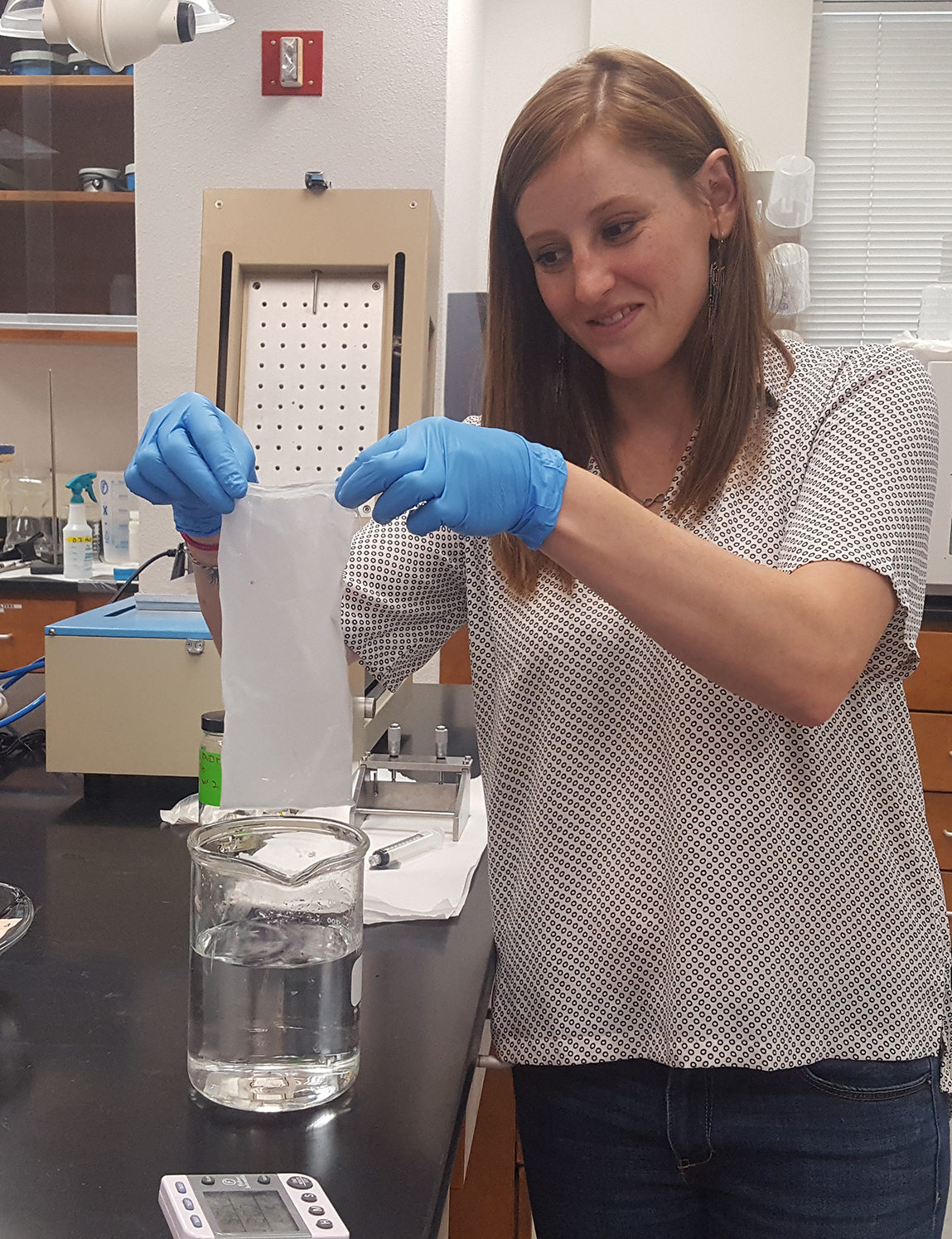 Carolyn Medin shows off a membrane in Dr. Huang's lab at New Mexico Tech